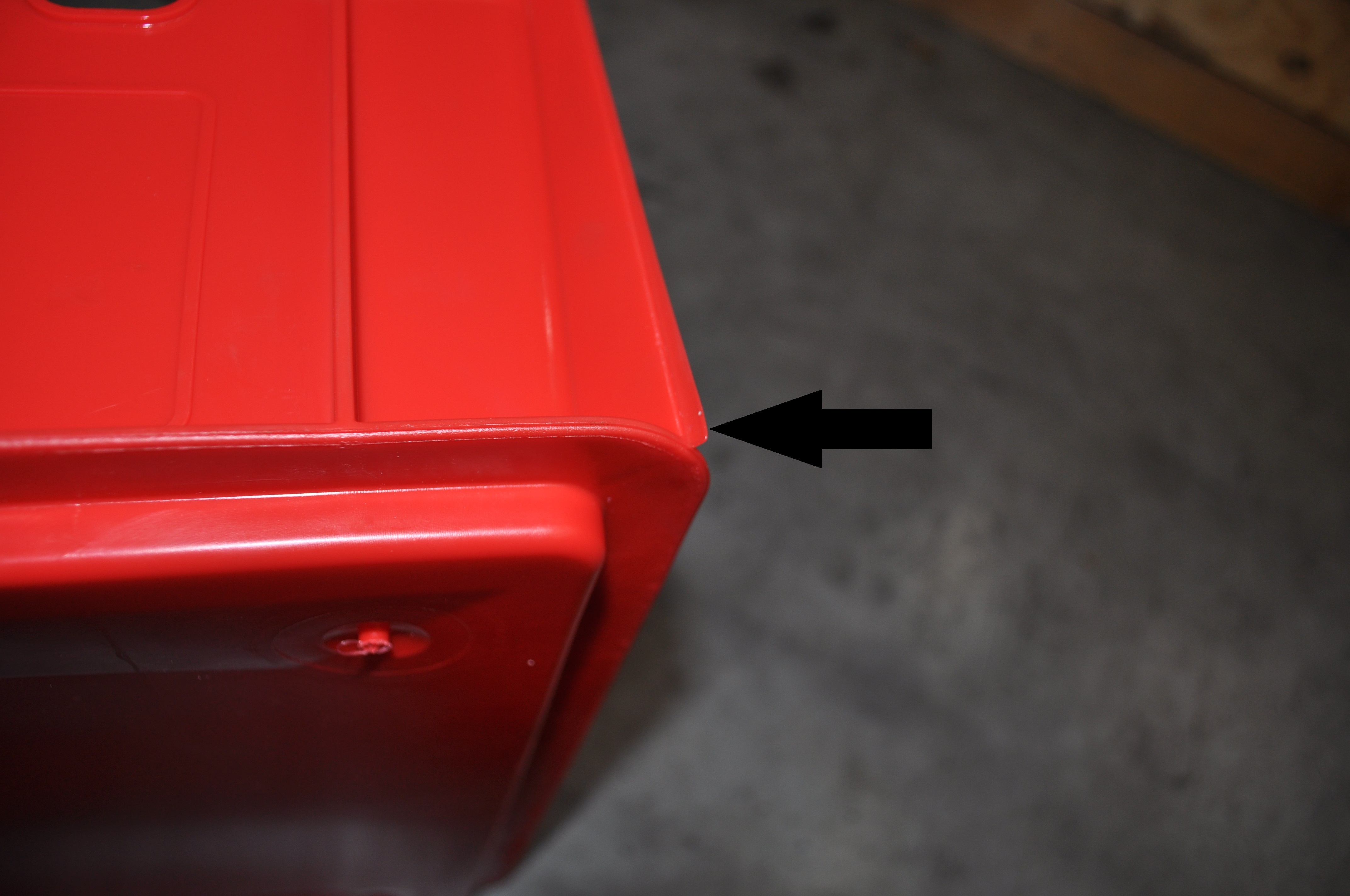 Réparation de deux coins et d'une arête d'empreinte d'injection plastique. Photos du défaut sur le produit fini, de l'arête affaisée, de l'arête rechargée et polie, des deux coins manquants et des deux coins rechargés et polis. Matière : cuivre-béryllium.
