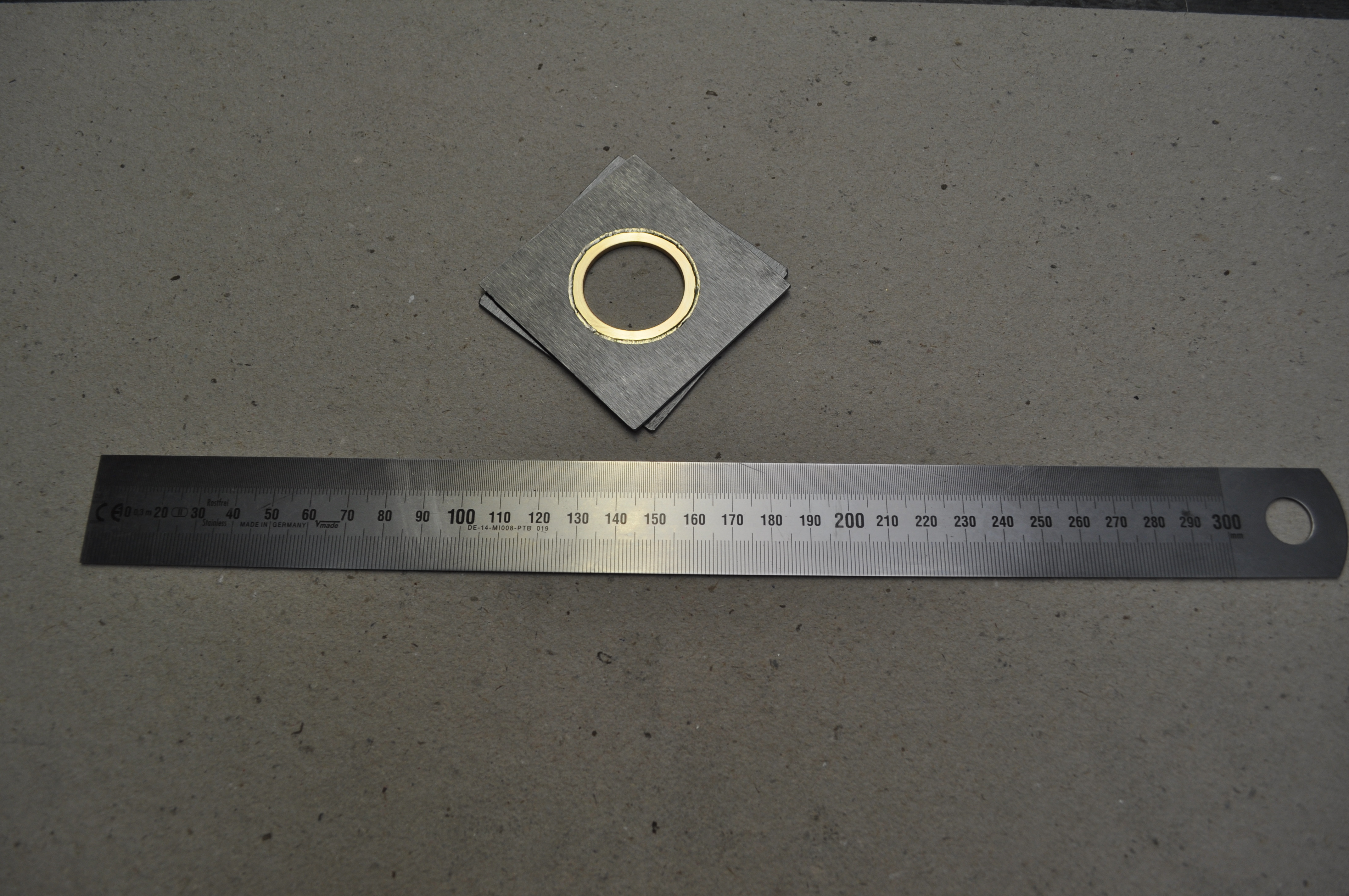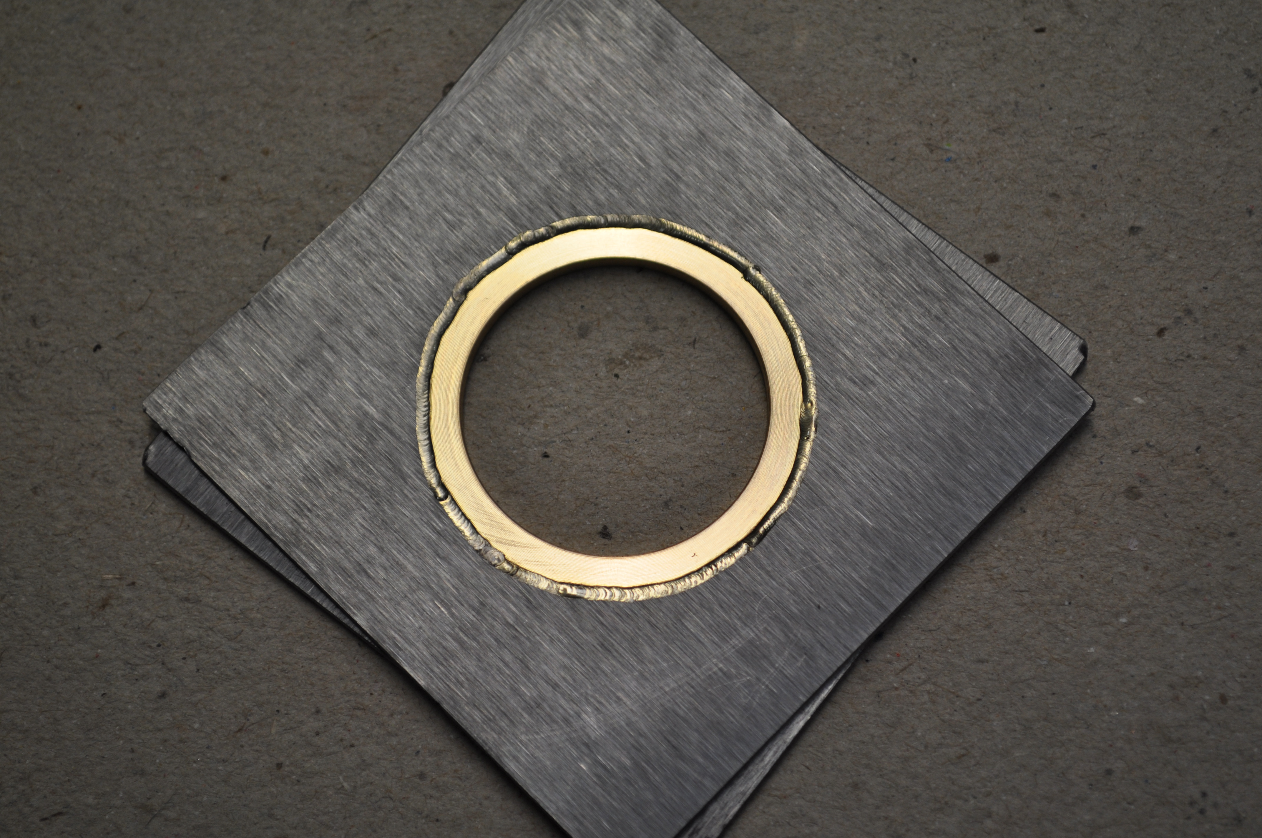 Assemblage d'un prototype d'outillage. Deux tôles d'acier glissant l'une sur l'autre autour d'une bague en bronze. Les tôles sont retenues à la bague par une battée sur le premier coté, et par une soudure acier-bronze sur le deuxième coté. Matière: 1.2312 - bronze